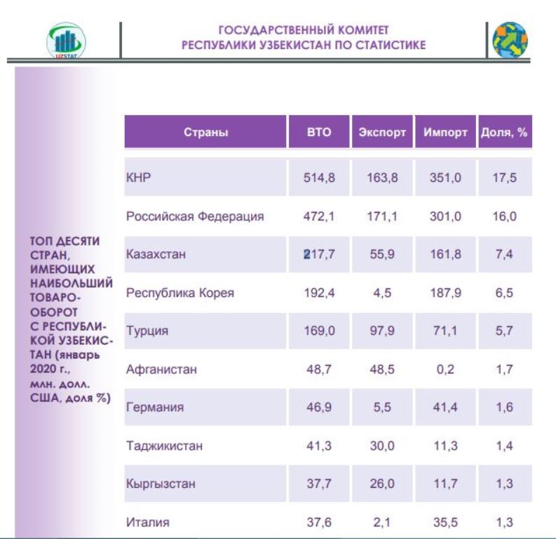 Между тем, Госкомитет Узбекистана по статистике сообщает, что двухсторонний товарооборот с Таджикистаном в январе 2020 года сложился в сумме $41,3 млн.