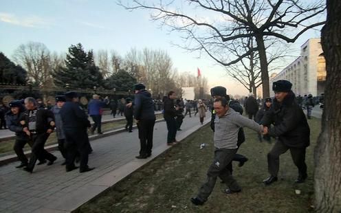 Некоторые участники акции в ответ кидались камнями. К 18:30 митингующих оттеснили с площади. Они двинулись на юг по улице Орозбекова, закидывая милиционеров камнями. В торговые центры ГУМ и «Дордой Плаза», находящиеся неподалеку, перестали пускать людей. Небольшие магазины и кафе стали закрываться.