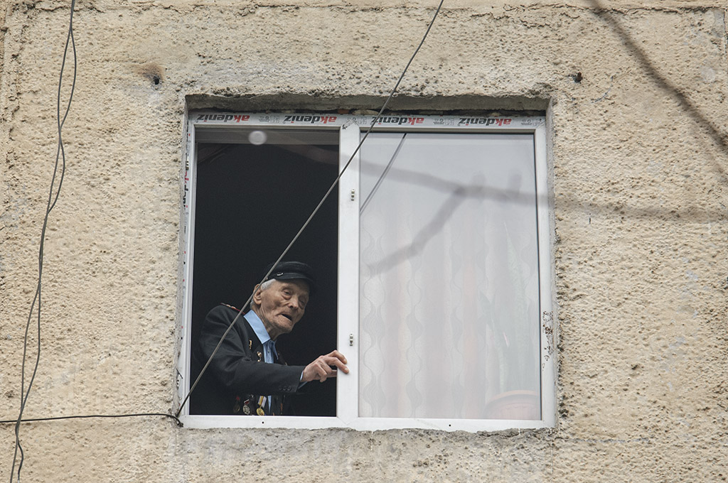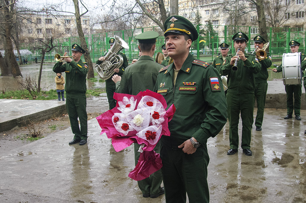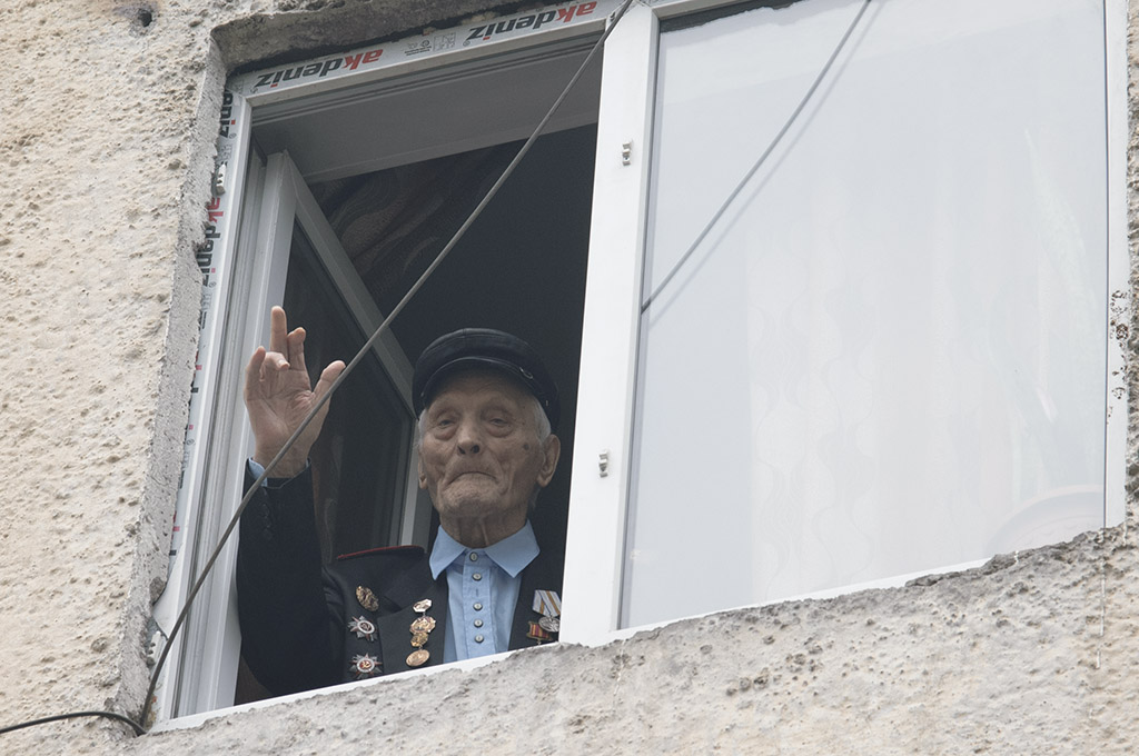 99-летний Николай Голиков наблюдал за действием из своего окна. Представители 201 РВБ вручили фронтовику также цветы и подарки