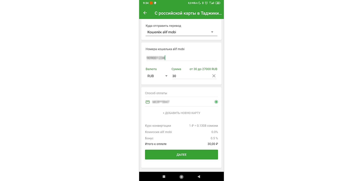 Выбираем куда отправить деньги – там можно на карту (Корти Милли) или прямиком на кошелек alif.mobi. Я выбрал второе. Ввёл номер телефона получателя и сумму.