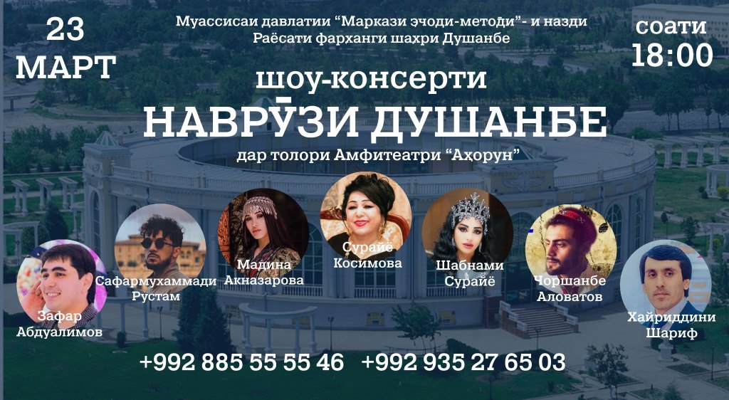 В рамках праздника Навруз в Душанбе в «Амфитеатре» 23 марта в 18:00 состоится концерт таджикских звёзд эстрады — Сурайё Касымовой, Шабнами Сурайё, Хайриддини Шарифа, Мадины Акназаровой, Сафармухаммади Рустама, Чоршанбе Аловатова, Зафара Абдуалимова.
