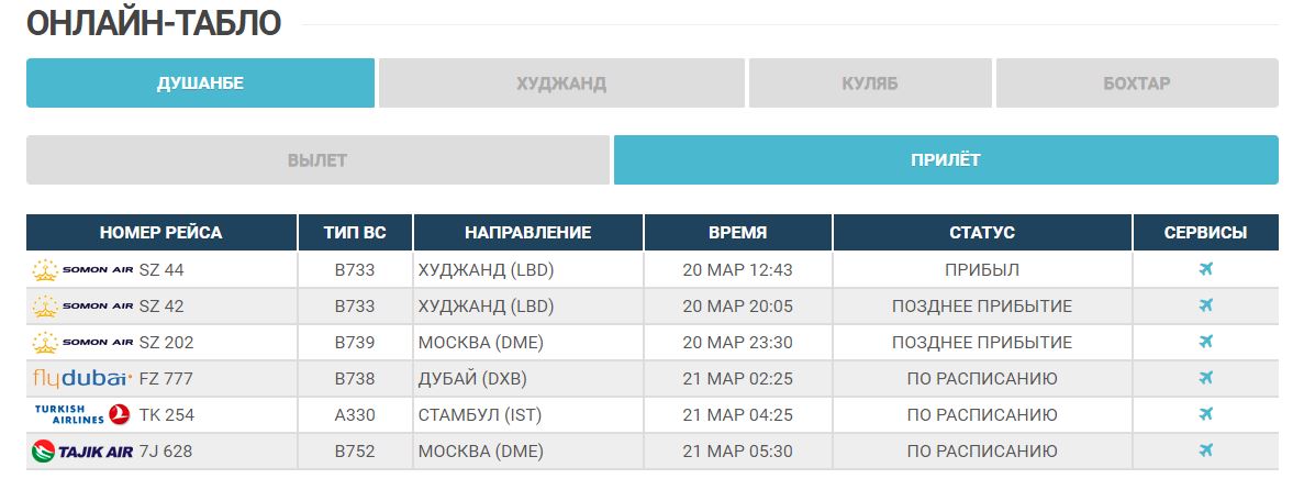 Согласно онлайн-табло «Таджикаэронавигации», в ближайшие дни для перевозки застрявших пассажиров будут осуществлены следующие рейсы: