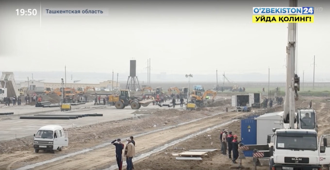 «Узбекистан 24» продемонстрировал кадры пустынной местности в Ташкентской области, где работают строительная техника и рабочие.