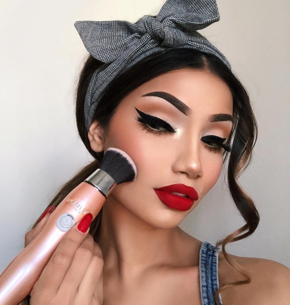 После нужно обязательно немного зафиксировать пудрой, чтобы тон держался. Затем нужно сухим скульптором слегка выделить черты лица. Так оно не будет выглядеть бледно, а, если присутствует ярко выраженная асимметричность, благодаря скульптору она выровняется.