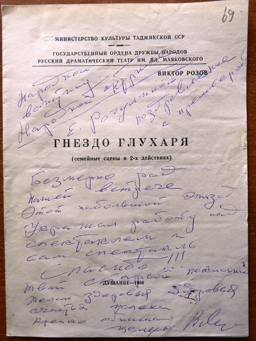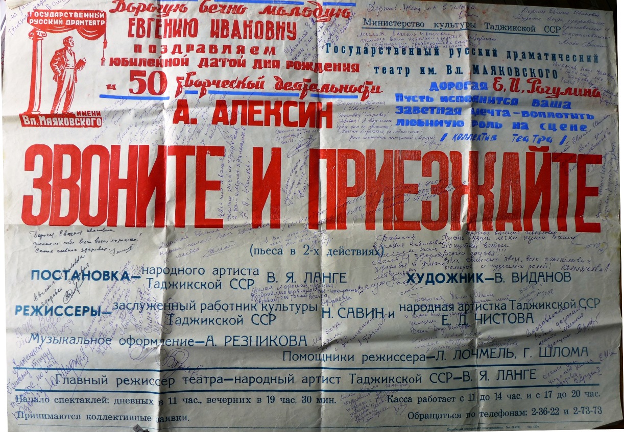 «…И вот Сталинабад. Все толпились возле окон. В жарком мареве чуть поблескивали снеговые вершины. На вокзале актеров встречали: пыль, жара и раздрызганная трехтонка (пятитонка?). Представителей партии и правительства не наблюдалось. Общественность представлял шофер Миша, белобрысый парень с облезлым носом. Во дворе Дома Красной Армии тоже никто не встретил. Ицкович убежал выяснять насчет квартир. Осеннее солнце жгло по-летнему», — вспоминали прибывшие актеры.
