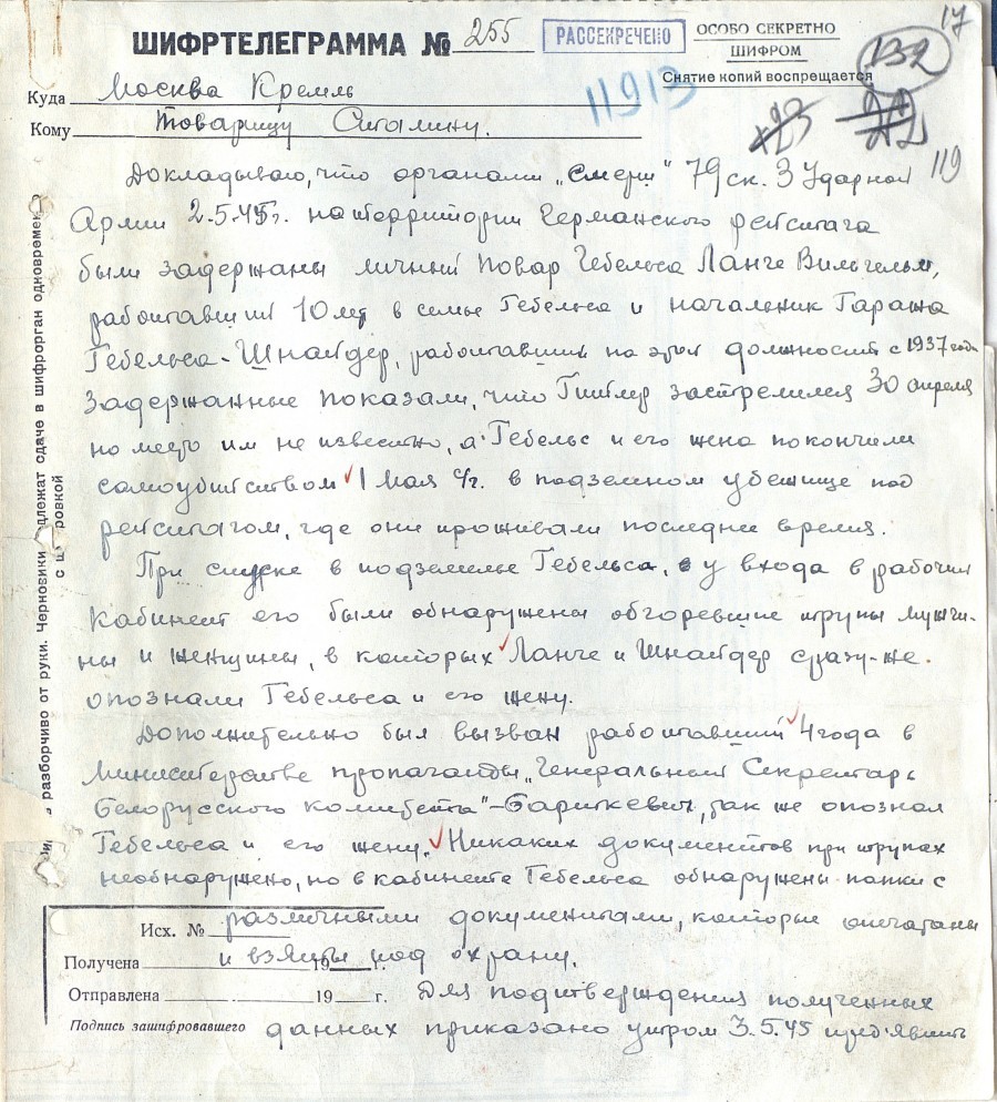Российское военно-историческое общество (РВИО) опубликовало донесение командующего 1-м Белорусским фронтом маршала Георгия Жукова главкому Вооруженных сил СССР Иосифу Сталину о добытых советской военной контрразведкой данных, касающихся самоубийства фюрера Третьего рейха Адольфа Гитлера и рейхсминистра пропаганды Йозефа Геббельса. Об этом сообщает РИА Новости.