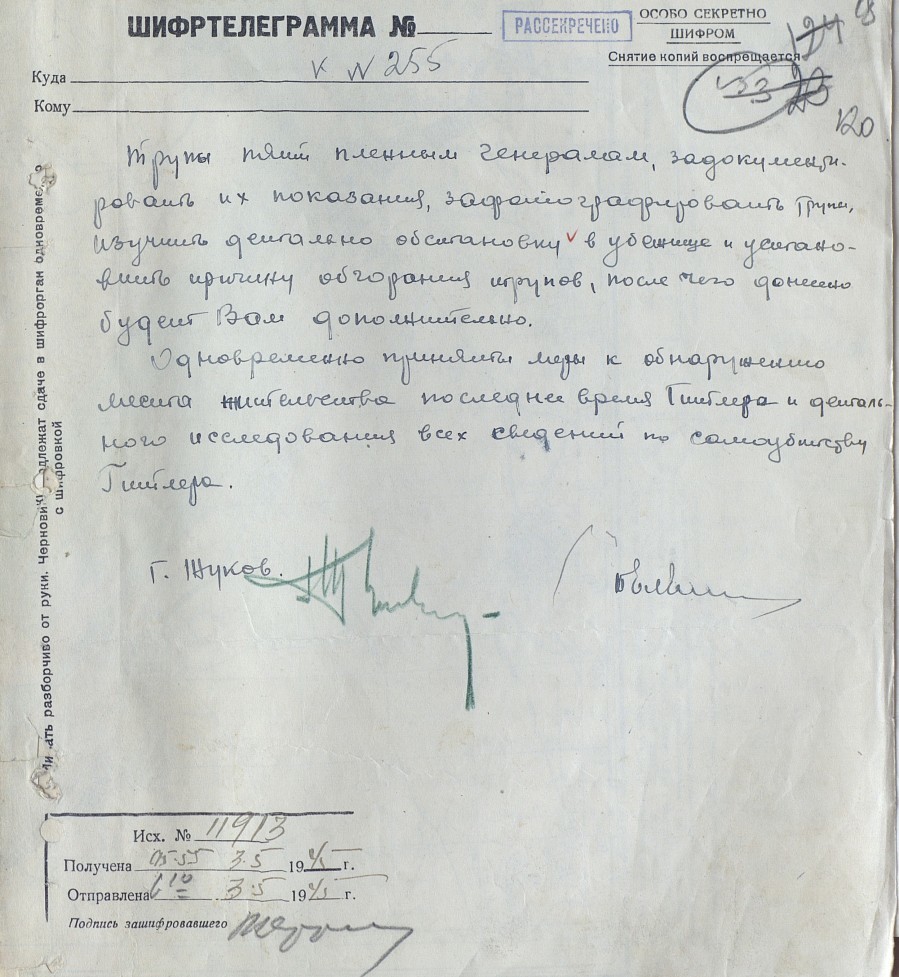 «Для подтверждения полученных данных было приказано утром 3 мая предъявить трупы пяти пленным генералам, задокументировать их показания, сфотографировать трупы, изучить детально обстановку в убежище и установить причину обгораний трупов, после чего донесено будет вам дополнительно», — сообщал маршал.