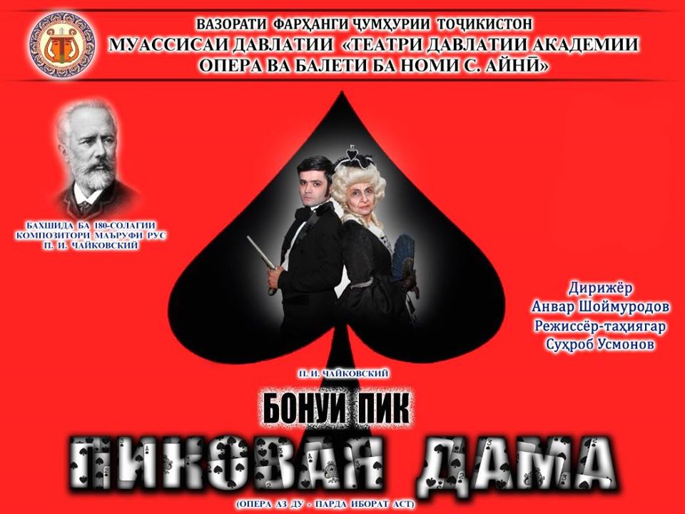 Несмотря на отмену празднеств, в Таджикском академическом театре оперы и балета имени Садриддина Айни, который, кстати, сказать, вошел в ТОП лучших театров СНГ, в честь 180-летия известного русского композитора Петра Чайковского, 19 апреля в 18:00 состоится премьера оперы "Пиковая Дама".