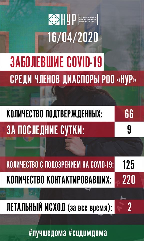 Региональная Общественная Организация «НУР», которая объединяет в России жителей ГБАО, на своей странице в Facebook сообщает, что 66 членов организации на сегодня заражены коронавирусом. Также говорится, что зарегистрированы 125 человек с подозрением на коронавирус, 220 контактировавших с больными и 2 случая смерти.