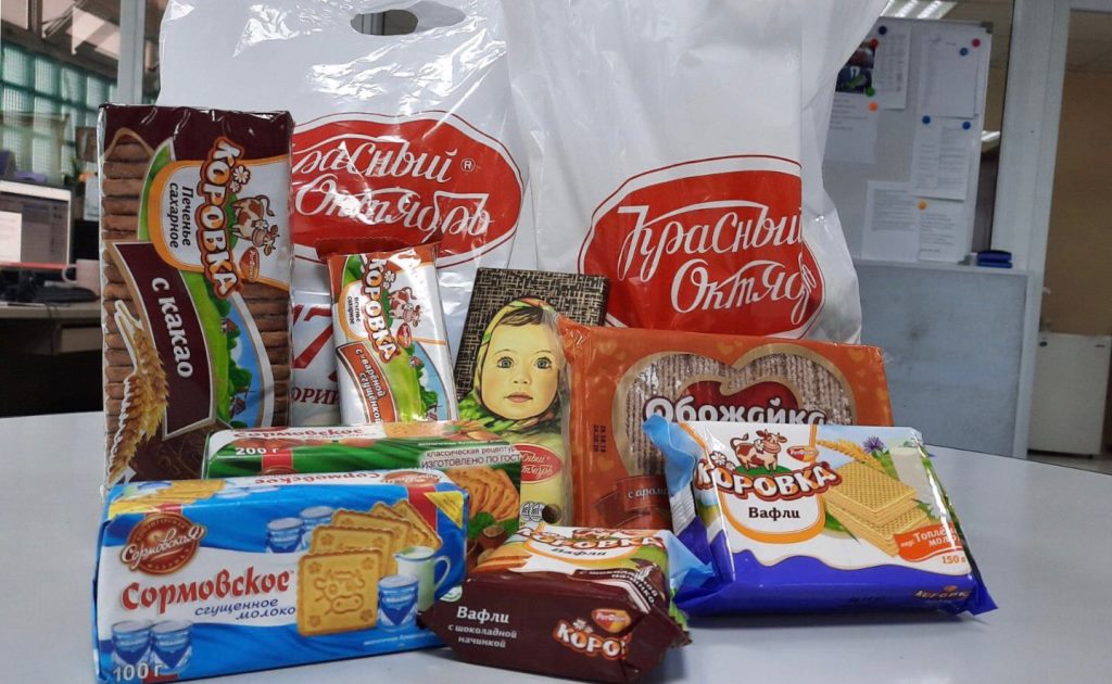 В подарок малыши получили шоколадки «Аленка», вафли и шоколадное печенье «Коровка», «Обожайка», «Сормовское» и многие другие кондитерские изделия.