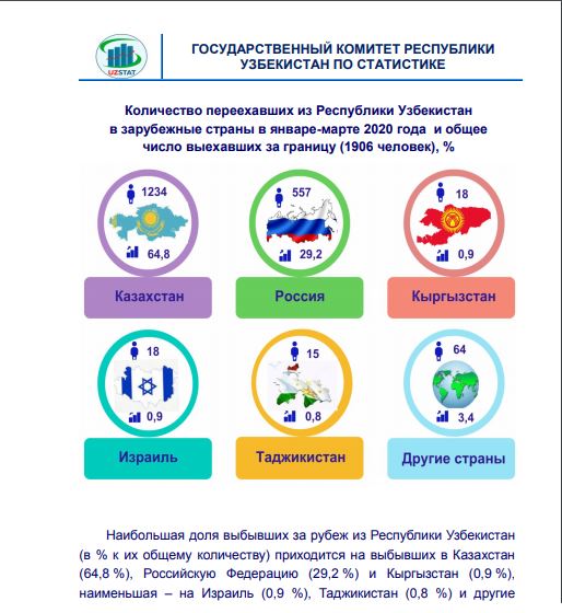 В основном люди переехали из Узбекистана в Казахстан — 1 234 человека, Россию — 557 человек, Кыргызстан — 18 человек, Израиль — 18 человек.