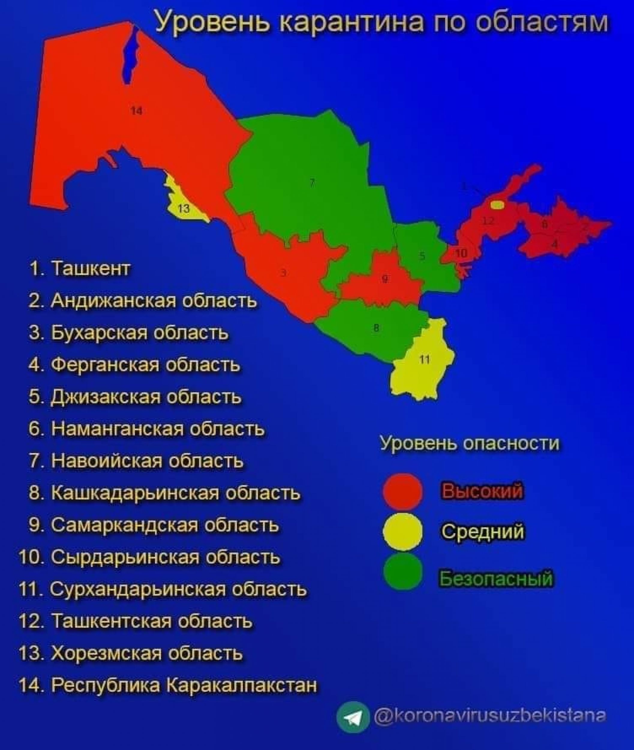 В «зеленую» зону, в которой нет зараженных коронавирусом лиц и нет находящихся на лечении от коронавирусной инфекции пациентов, вошли Навоийская, Джизакская и Кашкадарьинская области.