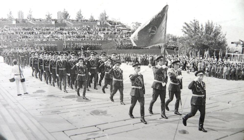 В сопровождении почетного эскорта мотоциклистов, в окружении боевых знамен частей 201-ой мотострелковой дивизии, горящий факел везли к парку Победы Герои Советского Союза Урунбек Якибов и Вениамин Недошивин.