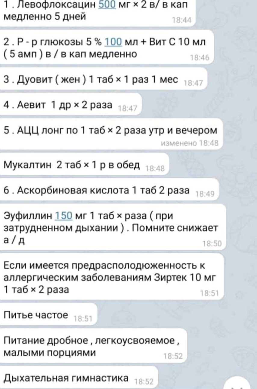 По вопросам симптоматики и лечения она обращалась к друзьям-врачам из других стран, которые работают с больными коронавирусом на передовой. Препараты приобрели по рекомендации коллег врачей с Алматы, Дубая и Дакки. Это: Vit D3, аскорбиновая кислота, антикоагулянты, антигистаминные, Парацетамол и Азитромицин. Также были рекомендованы дыхательная гимнастика и горячее питьё.