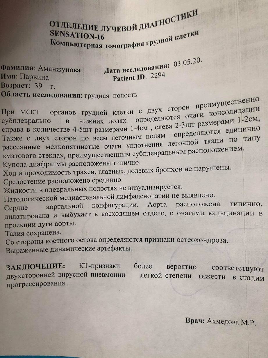 Бахтиёр лечится уже вторую неделю. Диагноз ему и его родным поставили по результатам КТ и симптомам. Кроме того, по его словам, он отправлял результаты специалистам в Россию и описал им состояние своего здоровья и здоровья родных. Там подтвердили, что Бахтиёр и его семья заразились COVID-19. И это при том, что они ушли на самоизоляцию ещё до официального объявления вируса в стране.