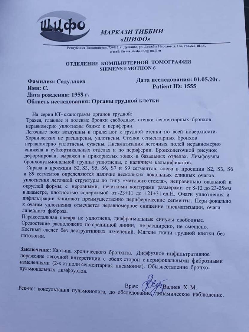 "После этого я записалась на цифровой рентген, но он показал обычный бронхит, — рассказывает Фаришта, — а у свекрови и мужа – двустороннюю прикорневую бронхопневмонию. Я записала их на КТ. Очереди ждали 2 дня, за процедуру заплатили 468 сомони с человека, и это ещё была цена со скидкой. Спустя 2 дня, нам сказали еще подождать. А ночью мужу и свекрови стало тяжело дышать. Позвонили в скорую помощь, но с нас потребовали подтверждение врача и сказали, что отвезут либо в Варзоб, либо в Гиссар, хотя было направление в «Истиклол». По словам сотрудников скорой, нам нужен был договор с этой больницей, и ещё они добавили, что могут туда отвезти мою родню, но их «точно не примут». В итоге, они так и не приехали".