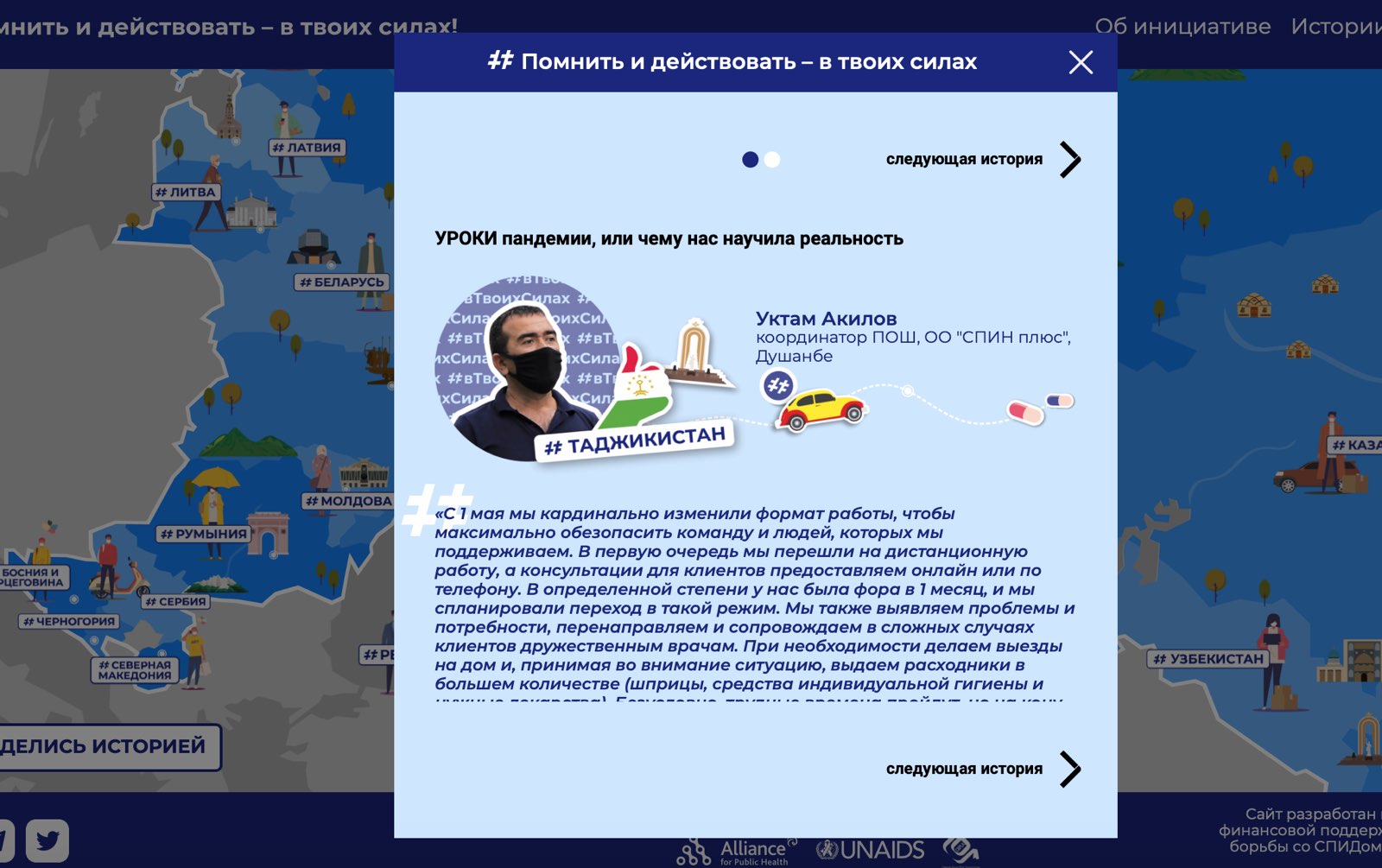 Своим опытом противостояния COVID-19 и ВИЧ/СПИДу уже поделились люди из 19 стран Восточной Европы и Центральной Азии, Прибалтики и региона Балкан: Азербайджан, Армения, Беларусь, Босния и Герцеговина, Грузия, Казахстан, Украина, Узбекистан, Эстония.