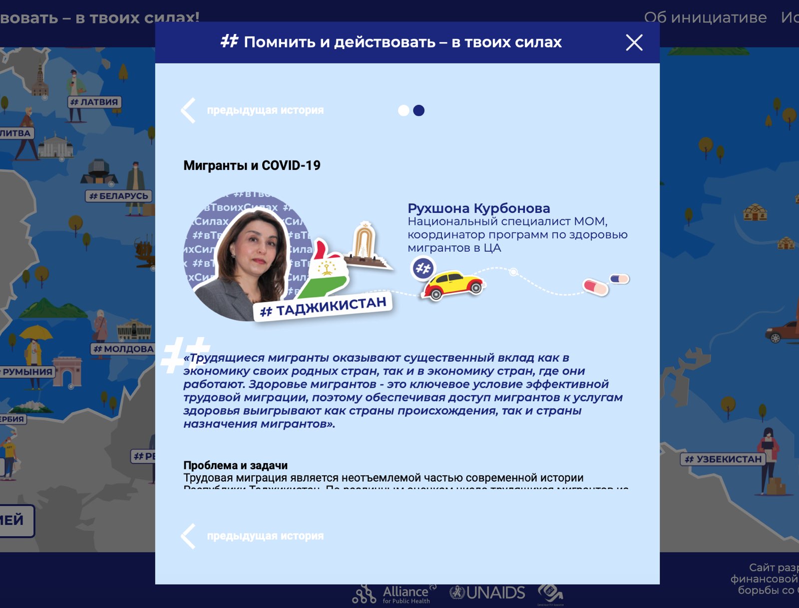Таджикистан тоже представлен на этой карте двумя историями. Это говорит о том, что на фоне коронавирусной инфекции таджикские НПО также продолжали активно работать. Двумя такими организациями в Таджикистане являются Международная организация по миграции (МОМ) и ОО «СПИН Плюс», а также активисты гражданского общества.