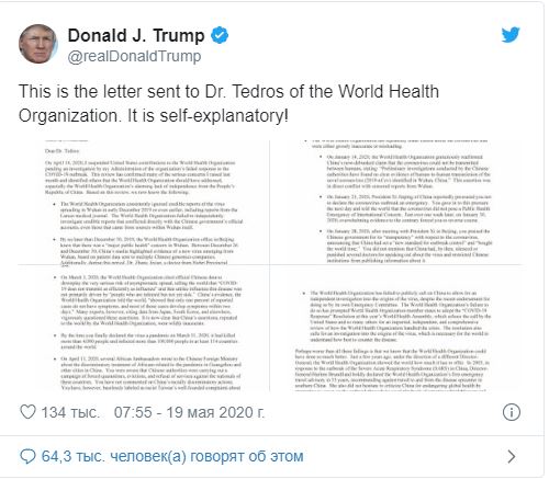 «Если ВОЗ не возьмет на себя обязательства по крупным существенным улучшениям в течение следующих 30 дней, я сделаю временную приостановку финансирования Соединенных Штатов постоянной и пересмотрю членство», — говорится в письме Трампа главе ВОЗ Тедросу Гебрейсусу, которое американский лидер опубликовал на своей странице в Твиттере.