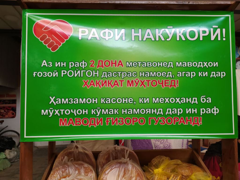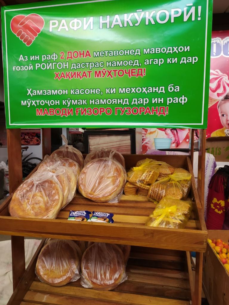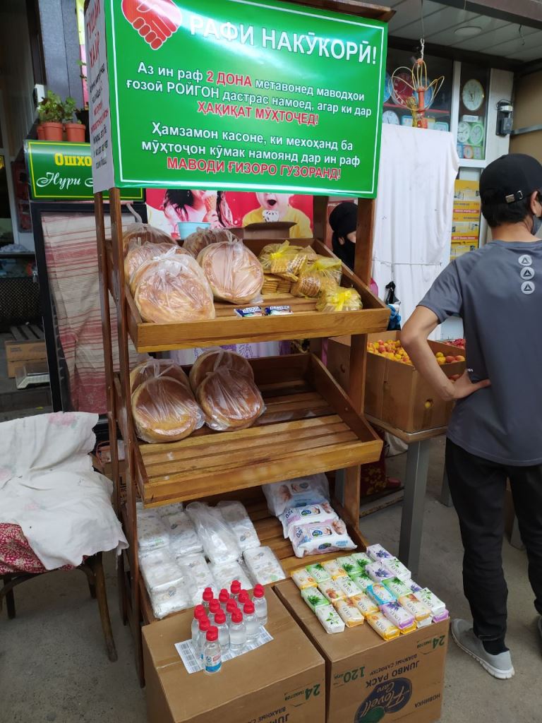 На рынке "Афгонбозор" предприниматели создали "Полку добра". Все желающие оставляют там продукты питания, а нуждающиеся могут забрать бесплатно.