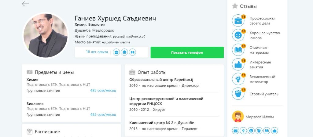 О каждом репетиторе вы сможете посмотреть всю нужную информацию прямо у него в профиле. Там указано всё, что может заинтересовать родителя: от сведений об опыте работы вплоть до фотографий документов. Таким образом, вы точно знаете, кому доверяете обучение своего ребёнка.