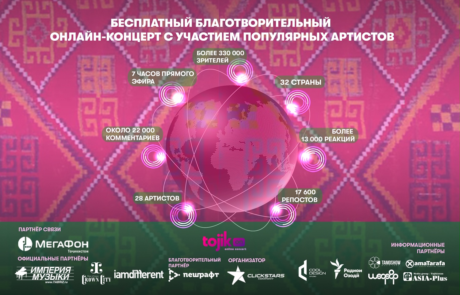 В ночь с 24 на 25 мая состоялся уникальный онлайн-концерт звезд таджикской эстрады, который помог поддержать врачей и семьи, пострадавшие от пандемии. Увидеть выступления любимых исполнителей можно было на платформе «ClickStars», а также на площадке партнера связи проекта, компании «МегаФон Таджикистан», в социальной сети Facebook. Только в группе оператора концерт в прямом эфире посмотрели более 280 000 человек. Организатором мероприятия выступило агентство «CLICKSTARS COMPANY».
