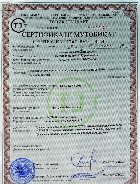 Таджикский фармацевт, руководитель ООО «Авиценна» города Душанбе Саидвали Хикматов начал производство бальзама, масла и антисептического раствора для профилактики вирусов, в том числе, и коронавирусов. Он назвал средства «Антиковид-19».