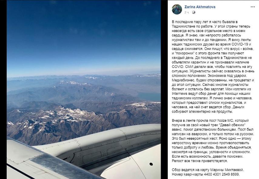 Казахстанские журналисты 3 июня объявили на Facebook о сборе помощи для таджикских коллег, которые в условиях пандемии оказались в сложном положении.