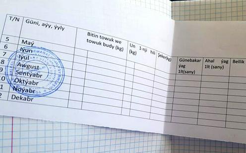 Как и в Балканабаде, карточки представляют собой обычную школьную тетрадь. Внутри степлером прикреплена справка из домоуправления о составе семьи, а на следующей странице – таблица, демонстрирующая полученный в текущем месяце объем того или иного продукта.