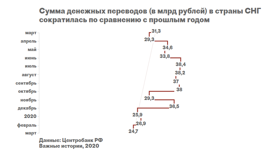 Уже в марте этого года (это самые свежие данные, опубликованные ЦБ) месячная сумма переводов в страны СНГ заметно сократилась: если в прошлом году за март из России отправили 31,3 миллиарда рублей, то в 2020 году — 24,7 миллиарда рублей , на 21% меньше.