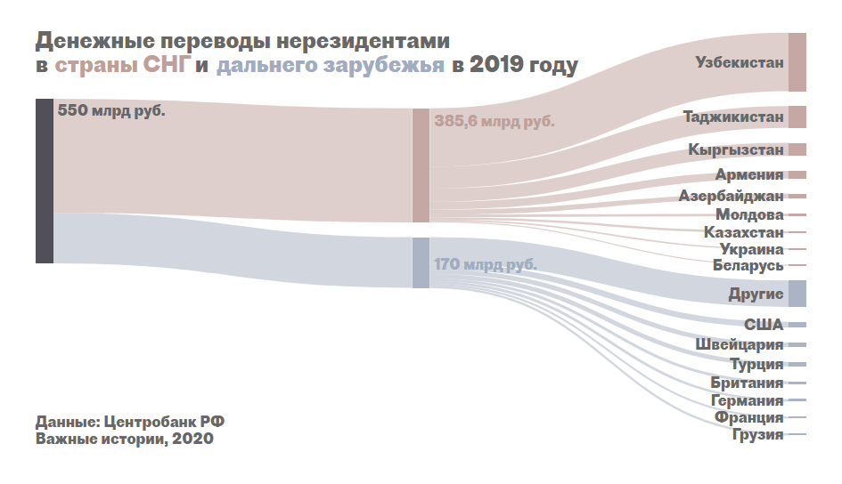 В 2019 году нерезиденты (то есть иностранцы) перевели из России в страны СНГ 384 миллиарда рублей — это в 2,3 раза больше, чем в страны дальнего зарубежья. Половина всех средств идет в Узбекистан, а на втором и третьем месте Таджикистан и Кыргызстан. Средняя сумма одного перевода в страны СНГ в 2019 года составила 20,6 тысячи рублей.