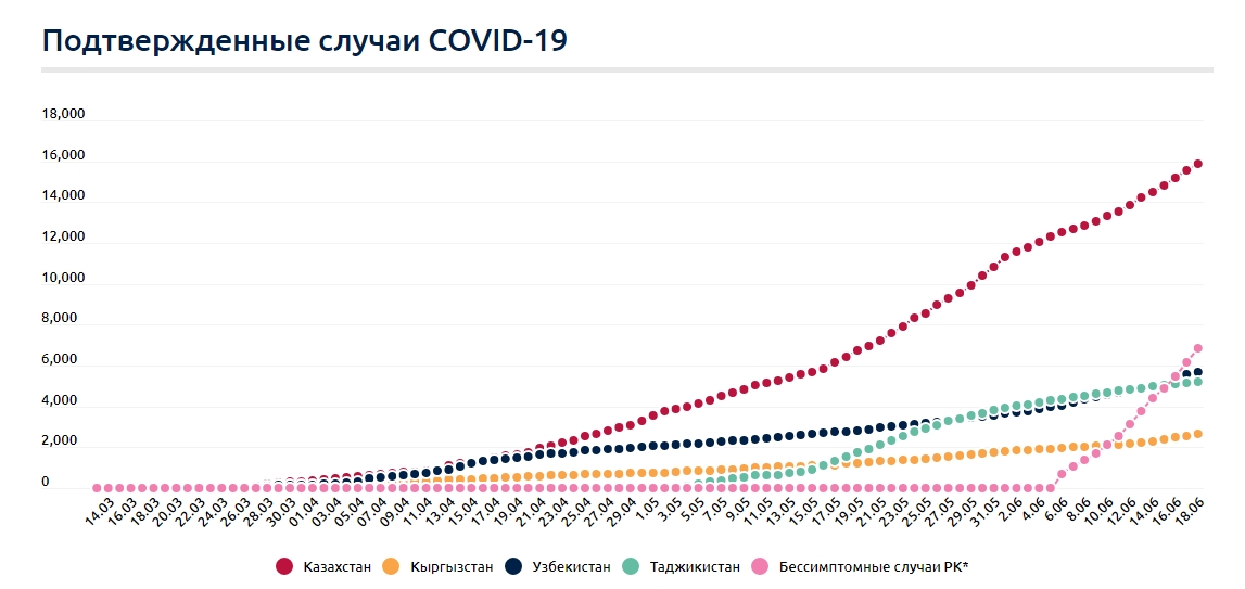 На сегодняшний день в Казахстане подтверждены более 15,8 тыс. случаев коронавируса, бессимптомных носителей более 6,8 тыс. (с недавнего времени в стране их отдельно считают). Жертвами коронавируса, по данным на 18 июня, стали 100 человек, выздоровели более 9900 заболевших.