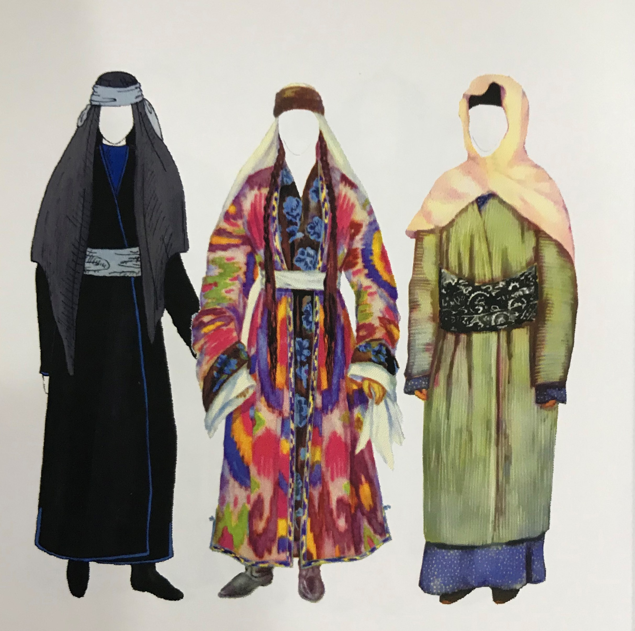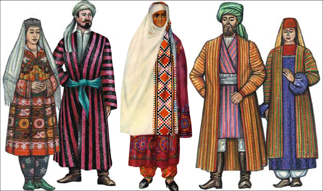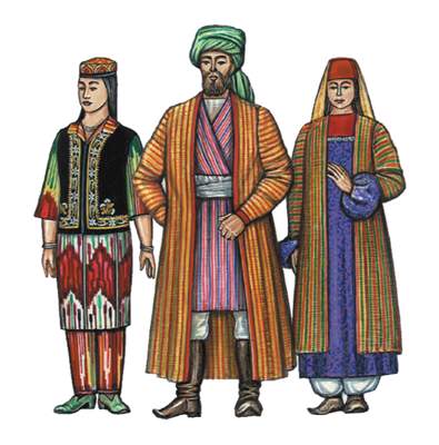 Кстати, состав костюмного комплекса женщин и мужчин был почти одинаковый. В комплект входили туникообразного кроя распашные и не распашные летние и зимние халаты кафтаны-халаты, рубахи, штаны со вставкой для шага, головные уборы, различающиеся в каждом районе, и пояса (для мужчин), а в доисламский период в определённые эпохи и женщины носили накладные декорированные пояса.