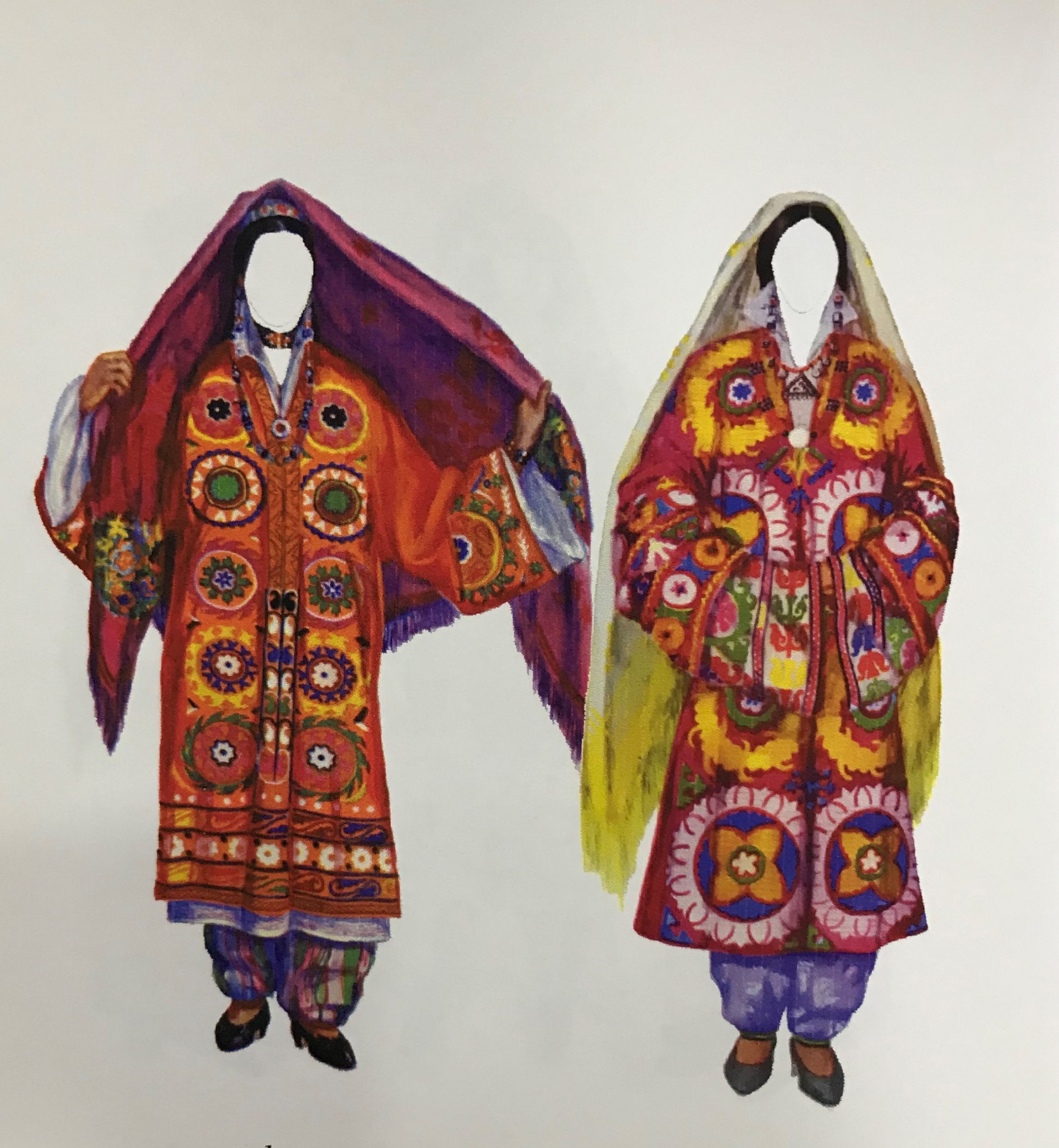 В центральных кишлаках верховьев Зеравшана в свадебный убор входили вышитые платки. Но иногда невесте на голову накидывали ещё и халат, или головную накидку.