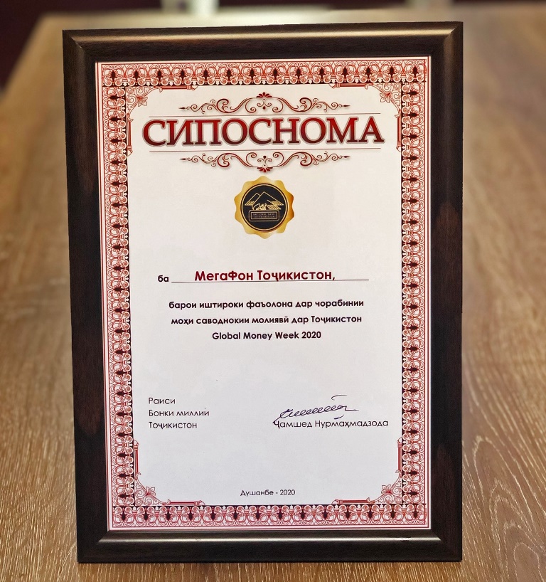 Национальный Банк Таджикистана вручил компании «МегаФон Таджикистан» благодарственное письмо за помощь в организации и проведении Global Money Week 2020. В рамках этого масштабного мероприятия партнеры провели республиканский конкурс, предложив школьникам и студентам создать творческие работы на тему финансовой грамотности.