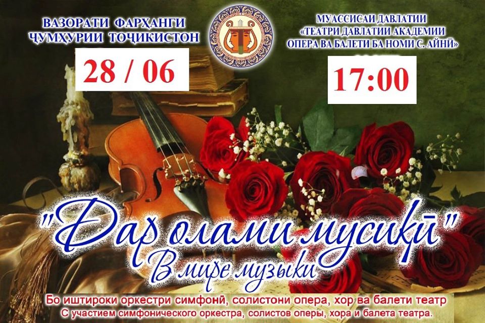 28 июня в 17:00 в Таджикском Государственном Академическом театре оперы и балета им. С. Айни состоится концерт "В мире музыки", посвящённый закрытию 79-го театрального сезона.