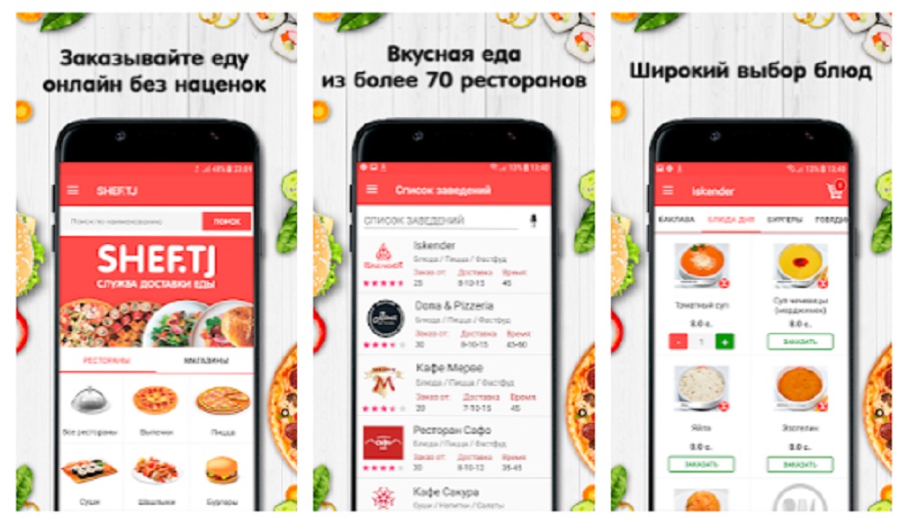 Например, сервис SHEF.TJ занимается доставкой еды из более 70 точек общепита Душанбе. Кстати, доставка осуществляется круглосуточно. Также сервис предлагает и доставку на дом продуктов питания, молочных и кондитерских изделий. Оплату можно производить как за наличный расчет, так и банковской картой.