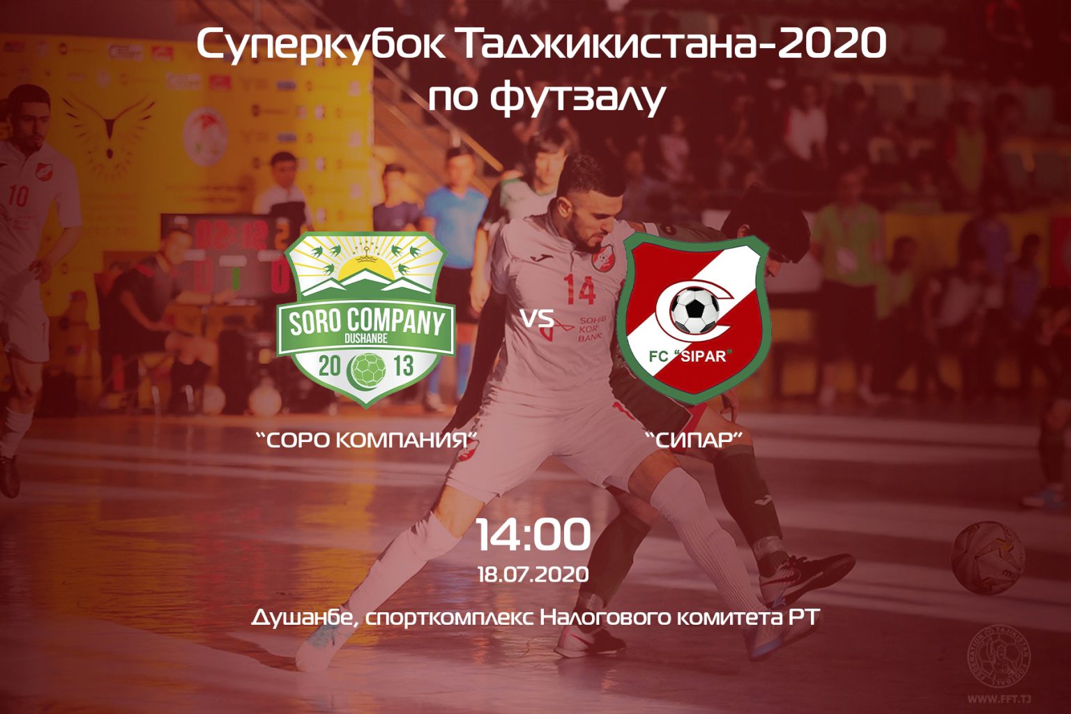 Матч за Суперкубок Таджикистана-2020 по футзалу пройдет 18 июля в спорткомплексе Налогового комитета РТ в Душанбе и начнется в 14:00 часов. За трофей поборются прошлогодний победитель профессиональной футзальной лиги Таджикистана душанбинская «Соро компания» и серебряный призер чемпионата худжандский «Сипар».