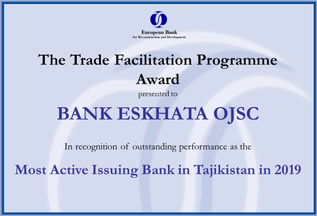 «Поздравляю с получением награды «Самый активный банк-эмитент за 2019 год в Таджикистане». Очень жаль, что мы не смогли вручить награду лично из-за COVID-19, но мы приветствуем ваши достижения на расстоянии», — отметил в своем письме Банку Эсхата младший банкир по программе Торгового финансирования группы финансовых институтов ЕБРР Икбол Хакимов.