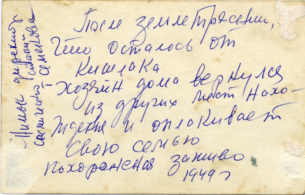 Катастрофа была такая, что погибло почти все население и Хаита, и близлежащих кишлаков. Сошлись два хребта, и все… Папка выжил, привез фотографии из этого ада. У меня есть пять из них – прямо с места событий! Папа рассказал — петух – единственное существо, оставшееся в живых в одном из кишлаков, где все и всё было погребено навсегда.