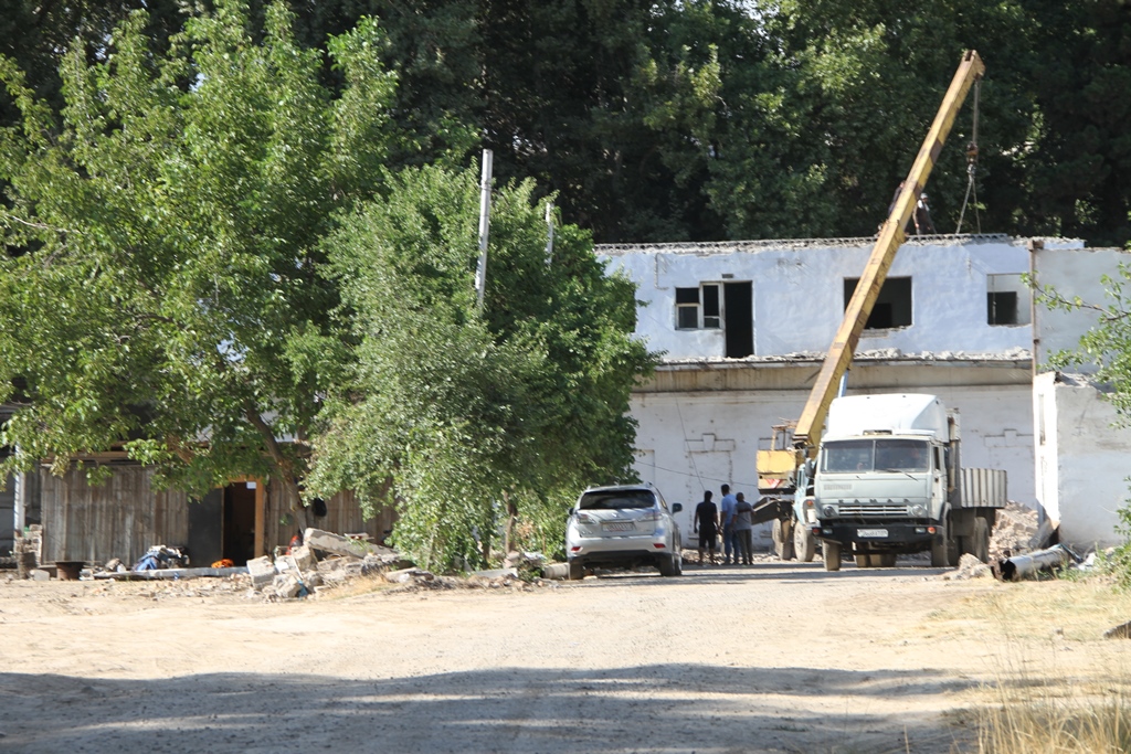 Снос здания начался с его правого торца, где в свое время были расположены Минводхоз и затем антикоррупционное ведомство Таджикистана.
