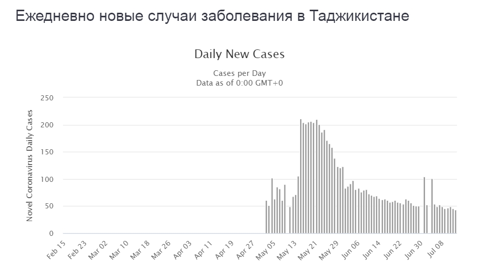 В Таджикистане о первых случаях заболевания было официально объявлено 30 апреля. При этом, как считает Минздрав РТ, пик заболеваемости пришелся на 15 мая и лето республика встретила значительным спадом и почти нулевой смертностью.