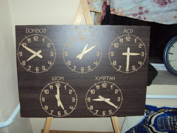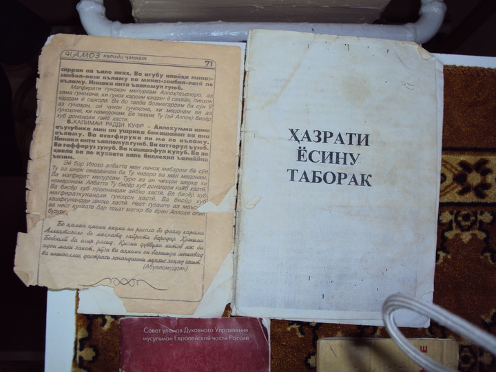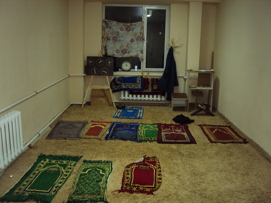 В комнате, где 27-летний уроженец Таджикистана организовывал намаз, окно занавешено простыней, на подоконнике — часы, чтобы всегда знать точное время. По углам — полки с книгами. На полу – ляух (подставка для книг) и молельные коврики.