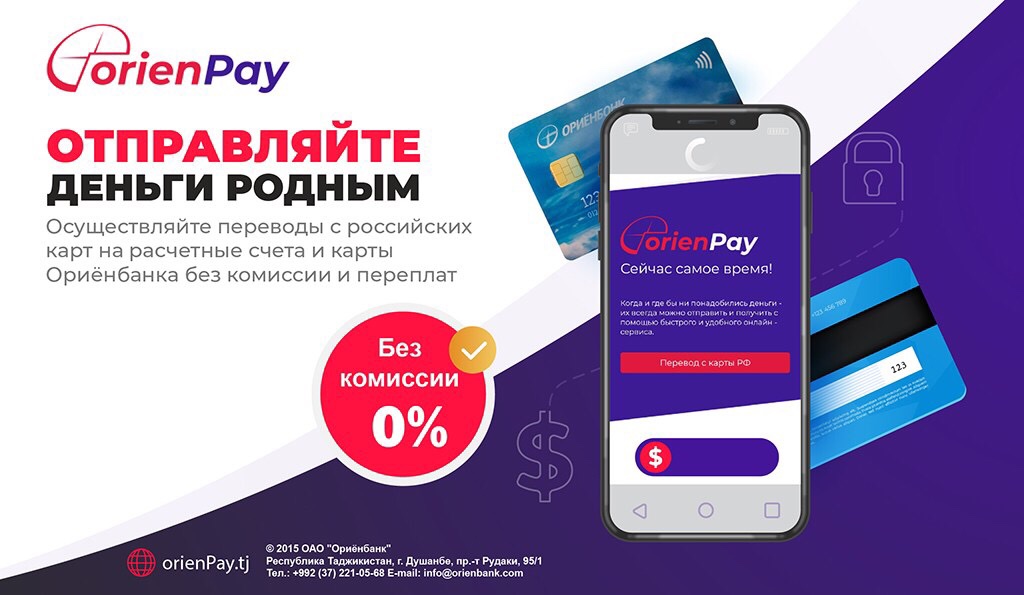 Сервис позволяет осуществлять мгновенные переводы, причем с любой российской банковской карты (Visa/MasterCard/МИР) в Таджикистан на любые карты и счета «Ориенбанка» — «Корти Милли», карты Visa, а также депозитные счёта!