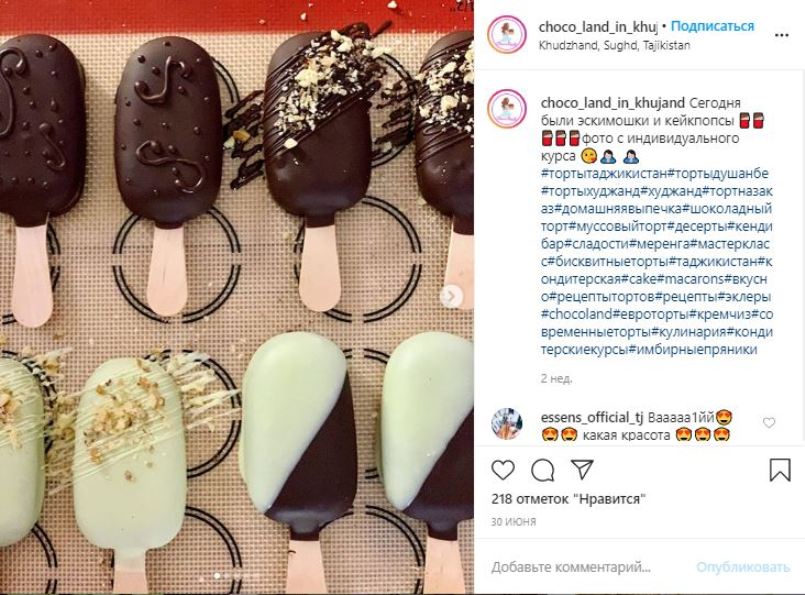 Популярностью пользуются и тортики жительницы Худжанда Адибы Дадабаевой. Количество подписчиков на странице – 13 881. На заказ девушка готовит также различные десерты, пирожные, заварные профитроли, рулеты с ягодами, кенди-боксы и другие вкусности.