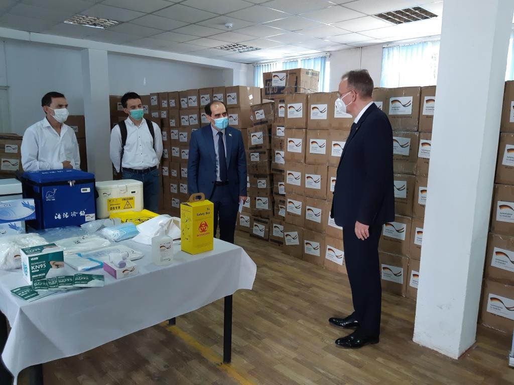 Посол германии в Таджикистане др. Андреас Протманн, первый замминистра здравоохранения Гафур Мухсинзода, а также местный представитель KfW Манучехр Бакоев передали средства индивидуальной защиты, приобретенные в рамках Финансового сотрудничества Германии и Таджикистана Больнице инфекционных заболеваний г. Душанбе под руководством Хуршеда Хабибзода.