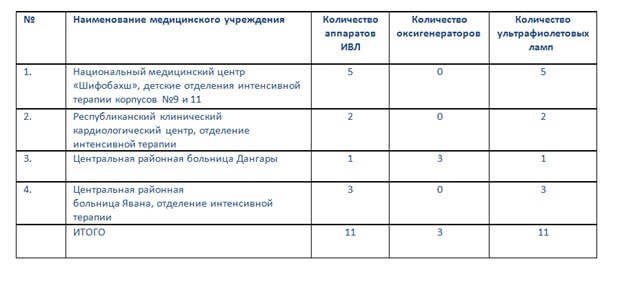 Средства были направлены на закупку 11 аппаратов искусственной вентиляции легких, производства Швейцарии (Hamilton) с полным комплектом одноразовых принадлежностей для бесперебойной работы в течение года в условиях полной нагрузки, которые будут переданы в Национальный медицинский центр «Шифобахш», Республиканский кардиологический центр, Центральные районные больницы в Дангаре и Яване . Эти больницы также получат УФ-лампы для целей дезинфекции.