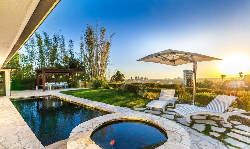 В доме имеется шикарный кинотеатр. В одной из спален открывается вид на знаменитые Голливудские холмы. Всего в доме три спальни. Помимо всего прочего, есть различные удобства — лифт, бассейн и спа.