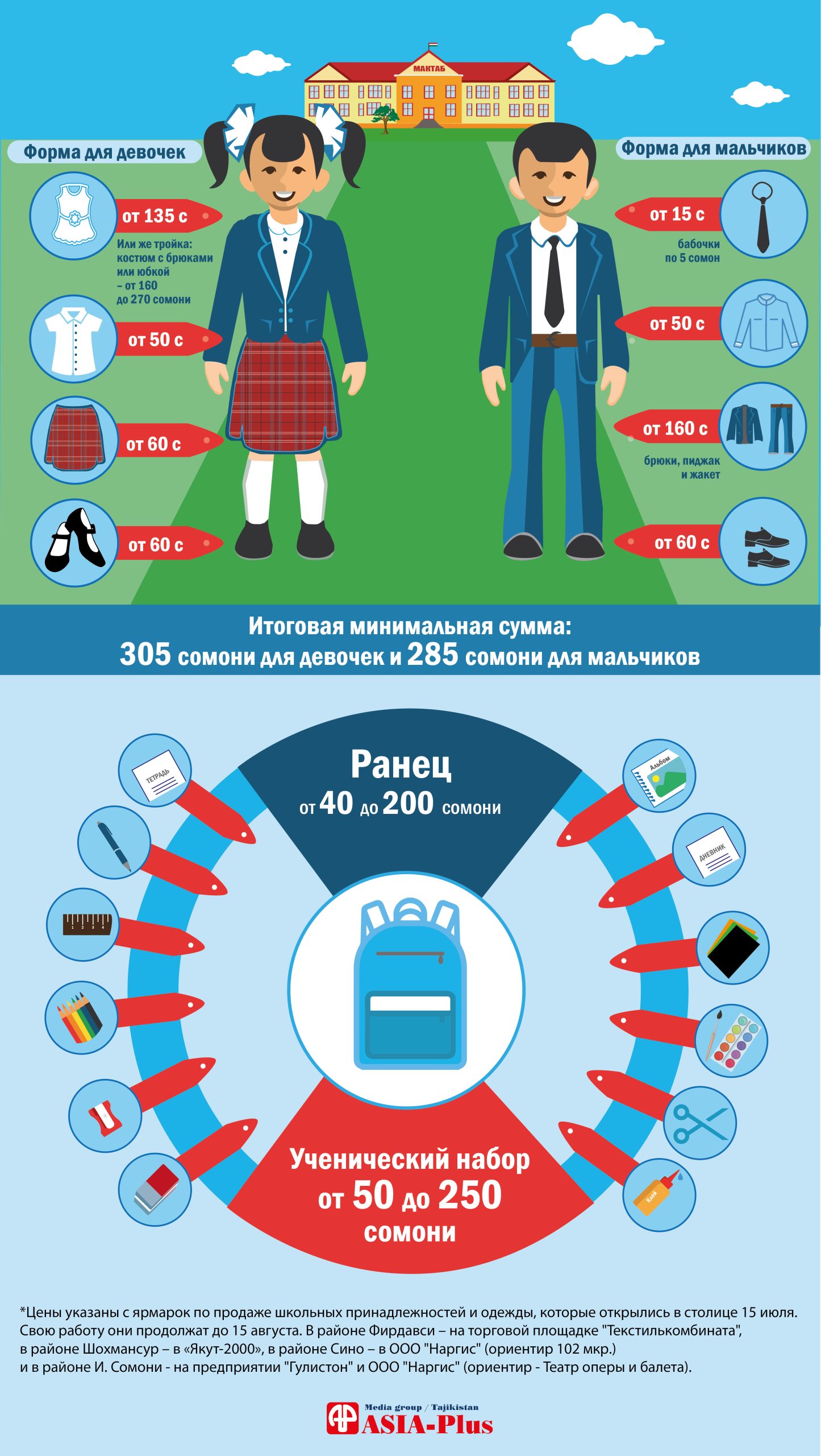 А где спортивная форма? На ту сумму который вы указали костюм для мальчиков уважаемые корреспонденты АП, материал будет из синтетики, который нк допустим для ребенка. Нормальные вещи для человека стоят куда дороже. И еще! Чтоб нащи производители выпускали нормальные х/б изделия, Точикстандарт должен научиться разбираться в качествах и установить барьер на ввоз некачественных дещевых ( мусор) из Китая. Легкой промышлености не будет пока вези прступают из Китая.