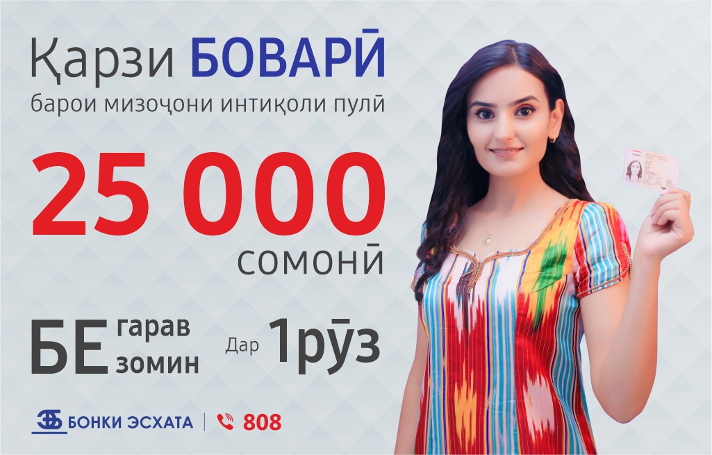 Банк Эсхата предлагает кредит «Бовари» до 25 000 сомони клиентам по денежным переводам. Требования к документам минимальные: только паспорт Республики Таджикистан и никаких других документов!